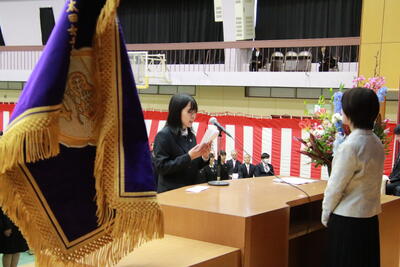 卒業証書授与では、担任によって呼名された卒業生たちの力強い返事が会場に響き渡り、在校生送辞や卒業生答辞では、心あたたまるメッセージが呼びかけられ、厳かな中にもあたたかみのある式典となりました。多くの参列者に見守られ、240名の卒業生たちが慣れ親しんだ学び舎を巣立ちました。