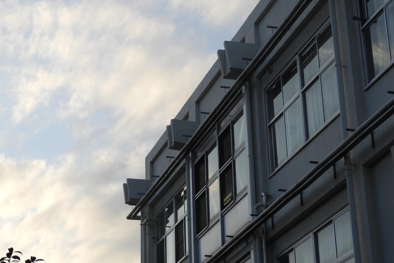 校舎の屋上、卒業式に向けて新調した国旗が翻る空 |