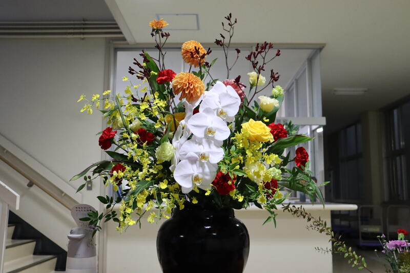 職員玄関前には、卒業式の際に飾られた花が飾られています。