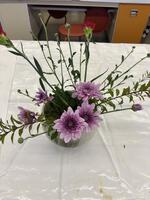 今回は、カーネーション・スプレーマム・ユキヤナギを生けました。