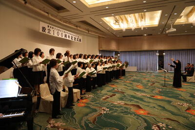 式典の終盤では、この記念合唱団に応募してくださった24歳から92歳の幅広い年代の同窓生約60名による合唱です。指揮は同窓会長の山本崇美さん、伴奏は副会長の石井陽子さんで、バラエティに富んだ合唱曲5曲を演奏しました。