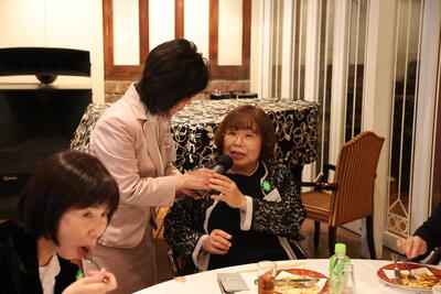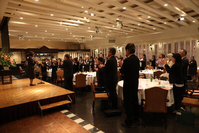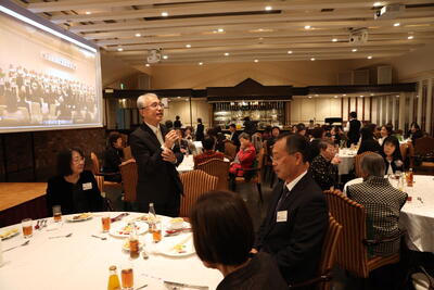 その後は祝賀会も開催され約120名が和やかな祝宴を楽しみました。歴代の校長先生からのメッセージや板橋副会長の突撃インタビューでたくさんの方のお話を聞くことができました。