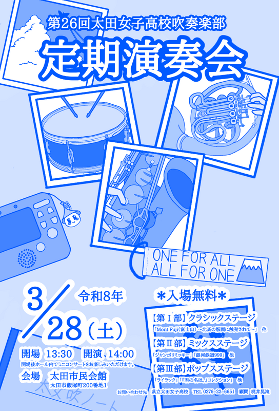 1年の集大成として太女吹サウンドをホールいっぱいに響かせます!太女に関わりのある方もそうでない方も、これから太女を希望する小・中学生も、チラシを見かけて気になっている方も、ぜひお気軽にお越しください!部員一同お待ちしております!