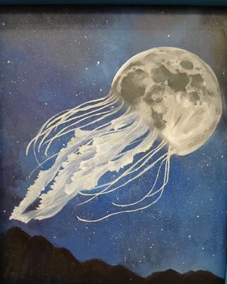 黒板の地の暗い色を陰の色として利用するため、明るい色で縁取るように木の幹を浮き上がらせるのですが、さすがは美術部員。いつもと違う着彩の手順にもすぐに適応。余裕で締め切りに間に合いました。