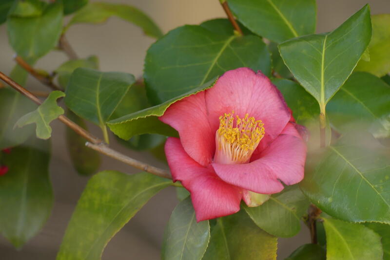 体育館横には、色鮮やかなツバキが花を咲かせています。